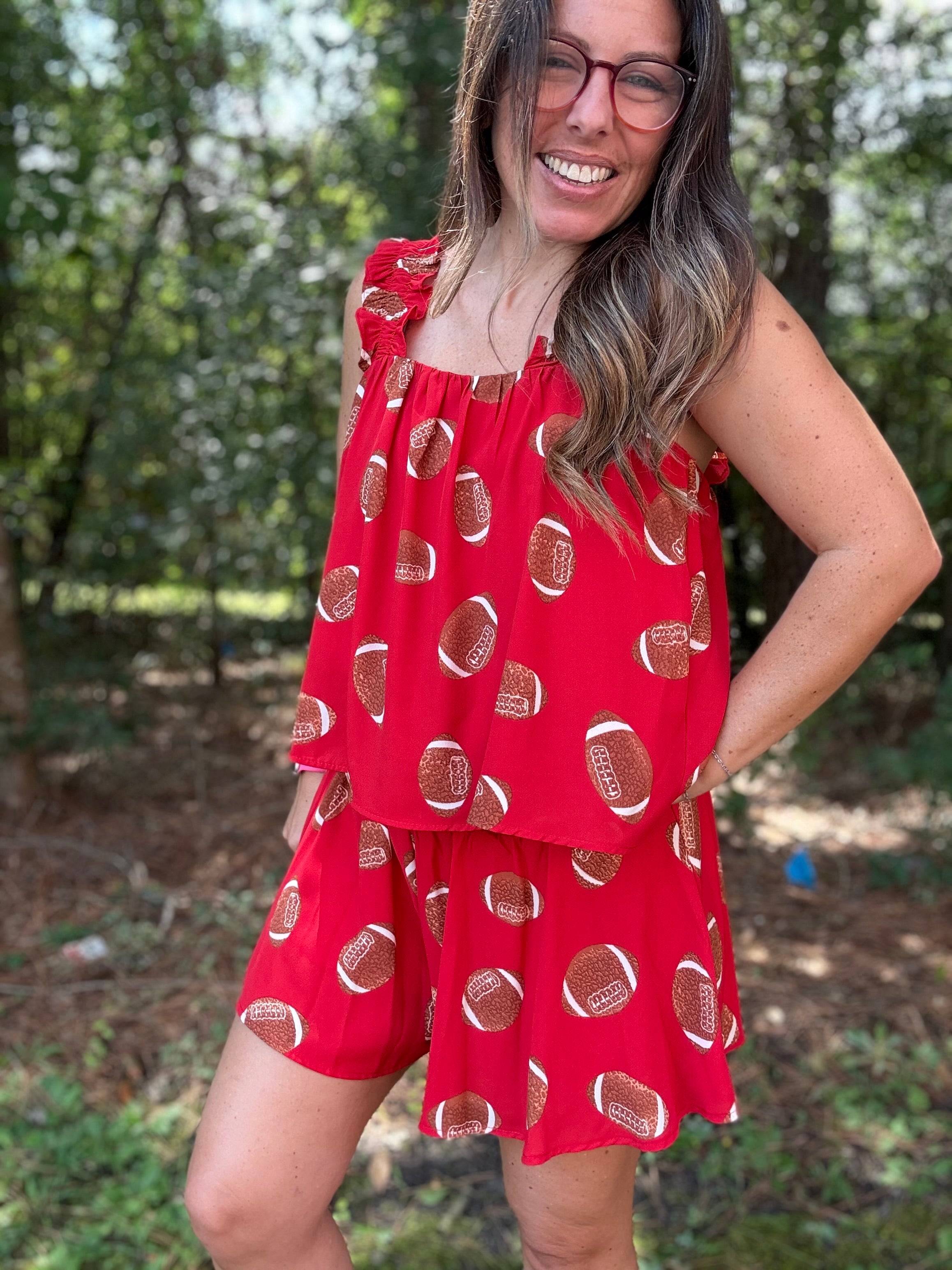SEO Keywords: football shorts for women, game day shorts, red football print shorts, boutique sports shorts, comfy game day outfit, Ava Wray Boutique