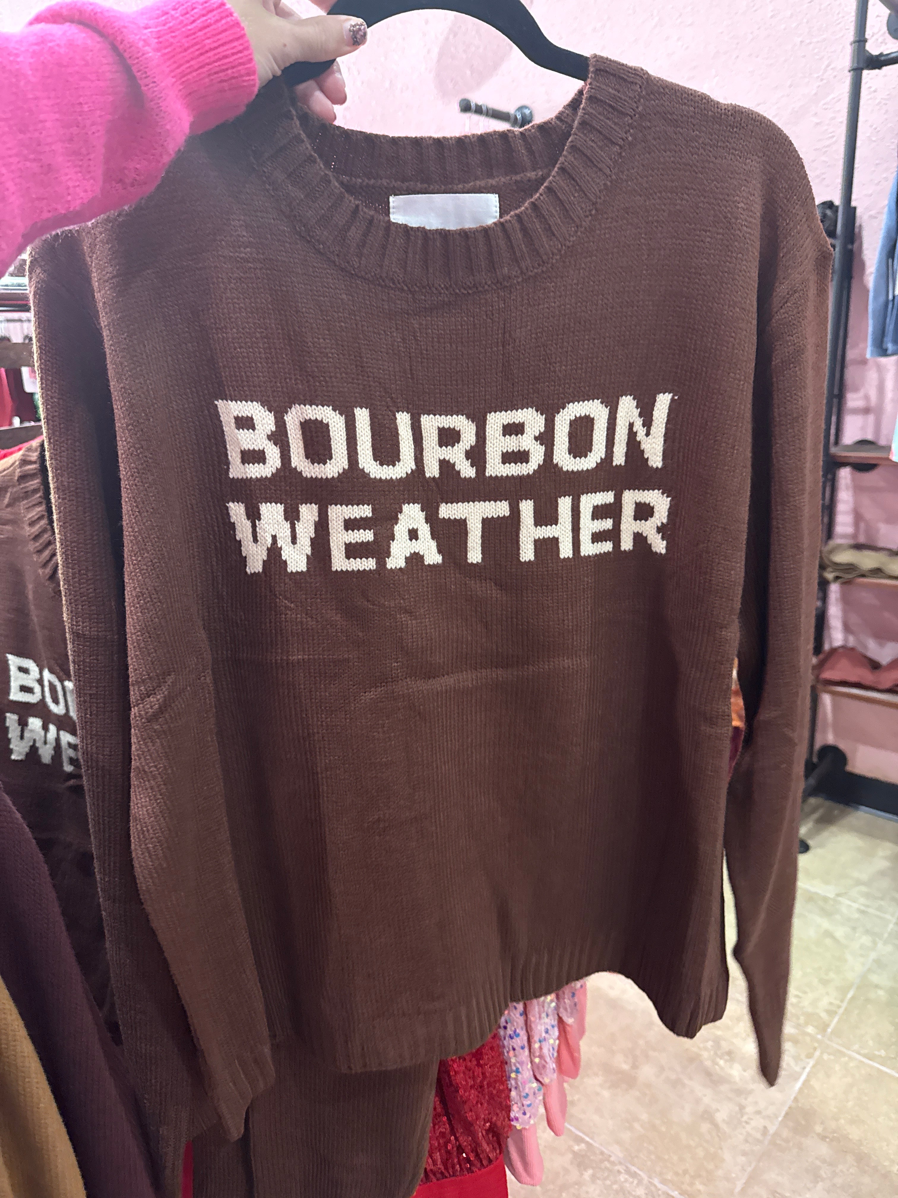 Stay warm and stylish this fall with our Bourbon Weather Sweater. Made from comfy materials, this cute sweater will keep you cozy on chilly days. Don't let the cold weather dampen your spirits, embrace it with our must-have sweater. Perfect for any fall adventure!