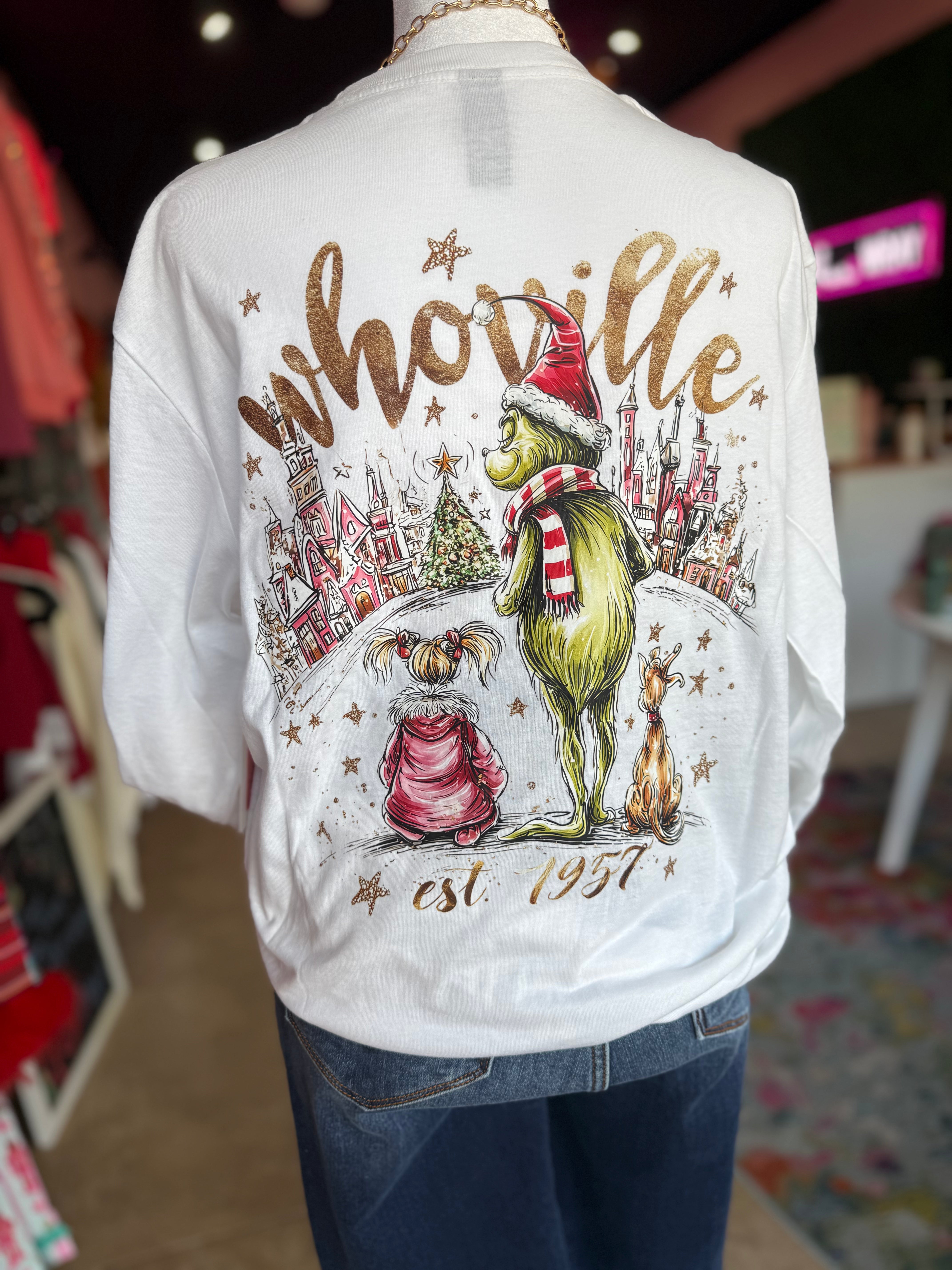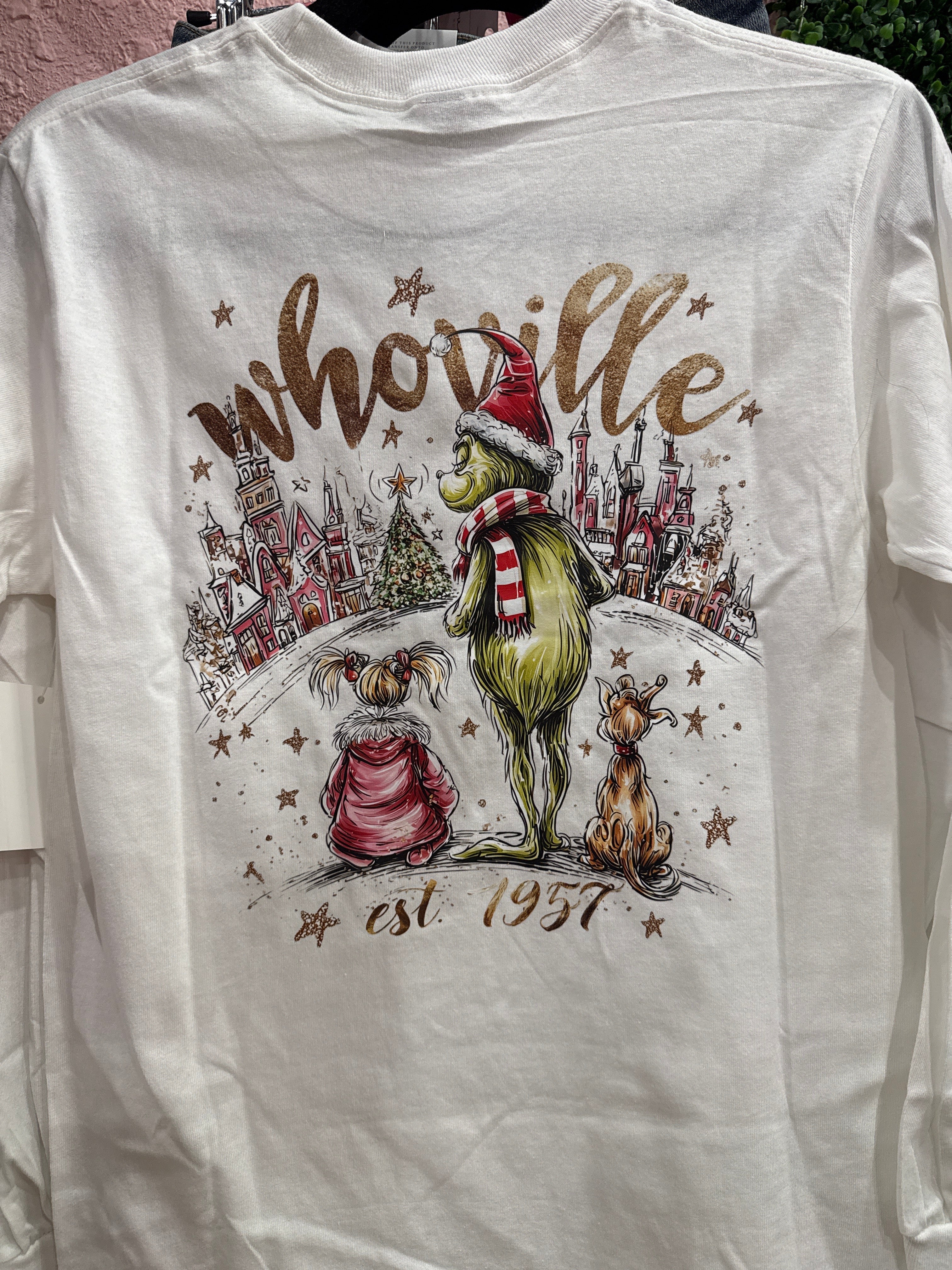 Keep cozy and festive with the Whoville est. 1957 Long Sleeve by Gildan. Embrace your inner Grinch in this white long sleeve, perfect for those chilly winter days. (Hint: It also makes for a great holiday party conversation starter!)