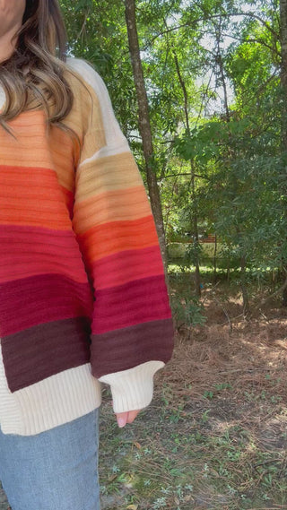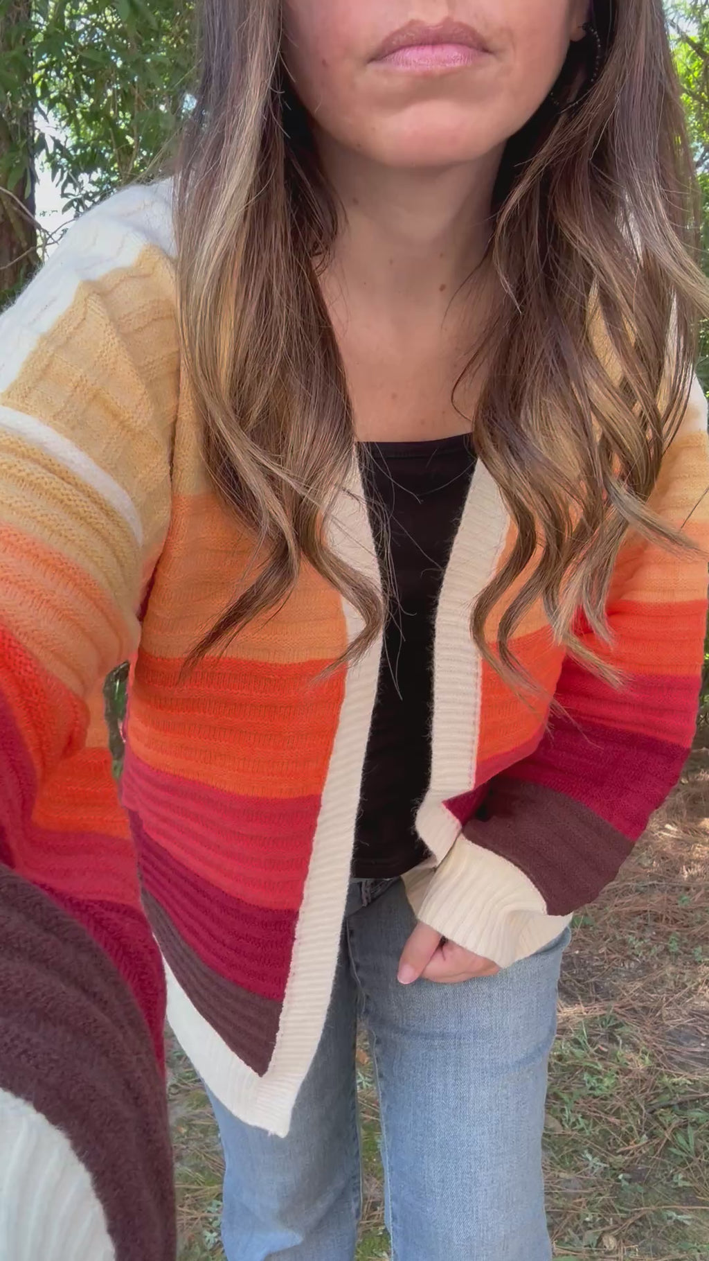 The Fall Dreams Cardigan features a vibrant ombre of autumn hues that catch the eye. Cozy up on crisp fall days and style it with your favorite booties for a fun, seasonal look!
