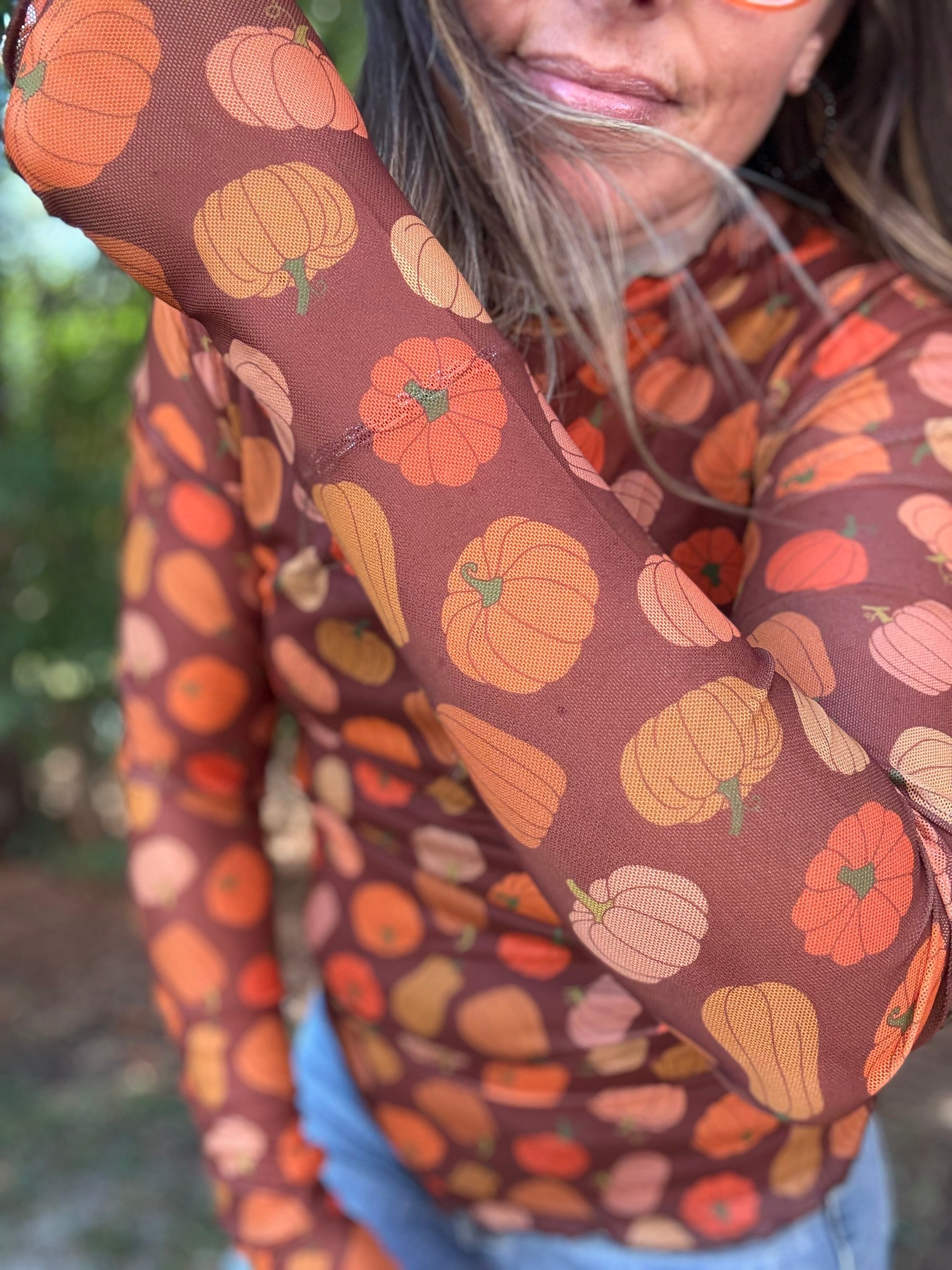 Get trendy with the Pumpkin Obsession Mesh Top in a fun fall pumpkin print! This playful top features lettuce hems, a mock neckline, and a sheer mesh material that can be layered under or over any outfit. Don't miss out on this must have piece!
