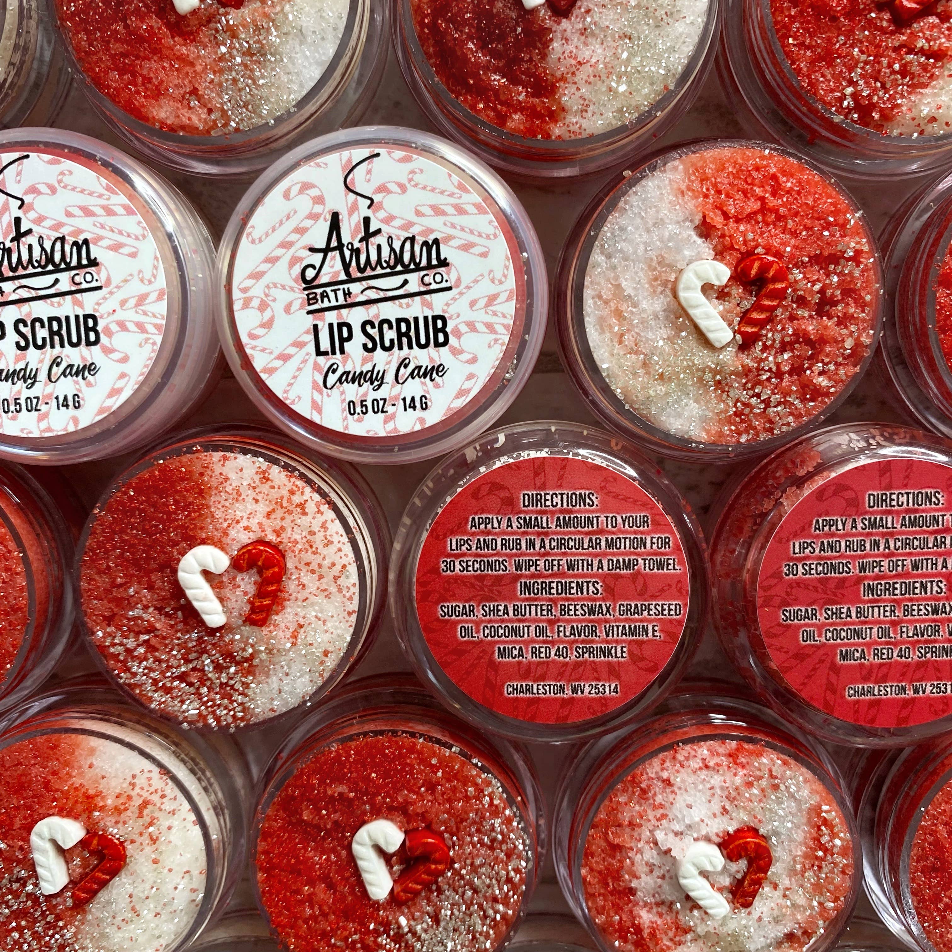 Our Candy Cane Lip Scrub has a classic vanilla infused peppermint flavor. It features a white & red color with silver & red sugar crystals along with 2 candy cane sprinkles arranged in a heart.