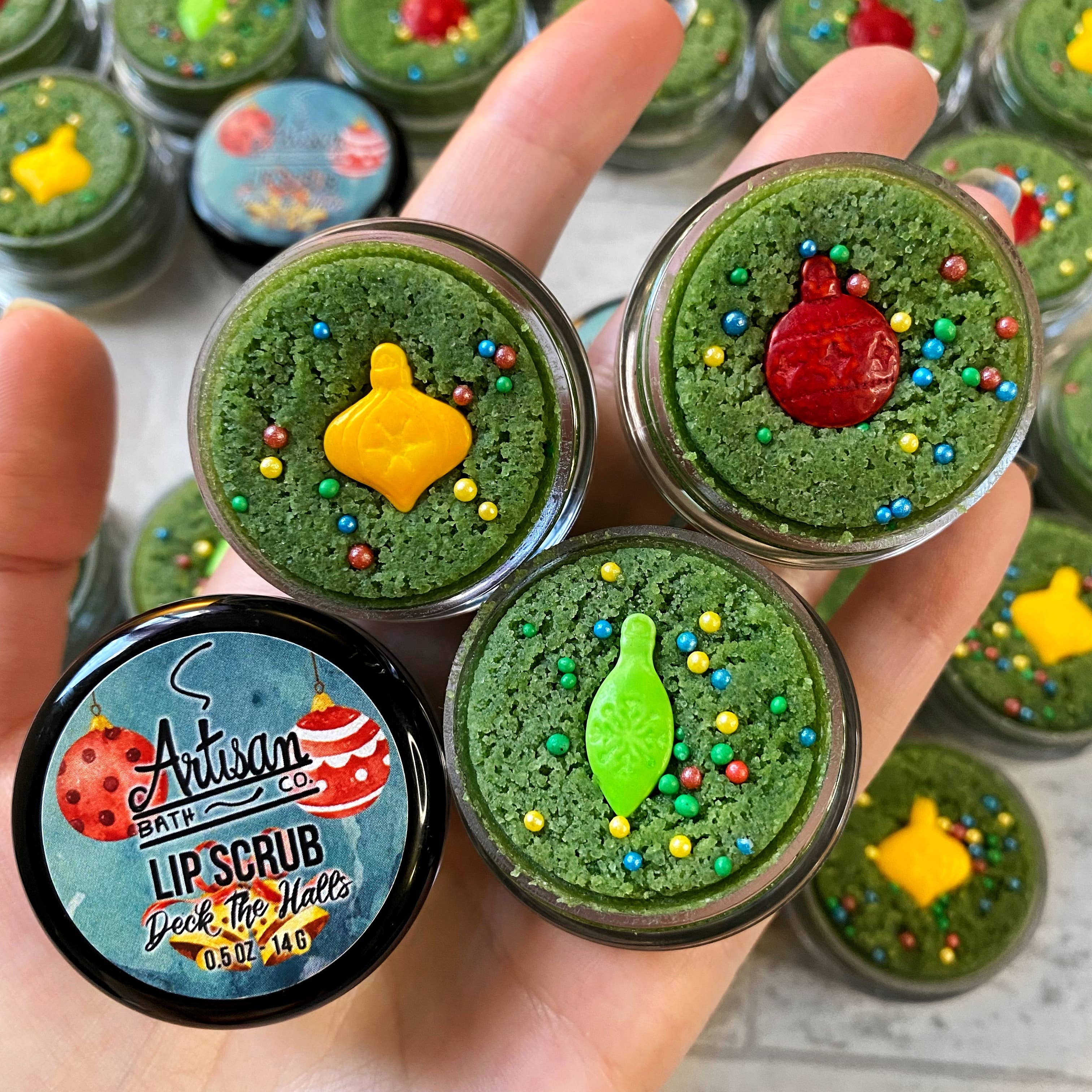Our next holiday lip scrub will have you ready to deck the halls. It has a winter candy apple flavor. It features an ornament sprinkle among colorful nonpareils on a darker green base.