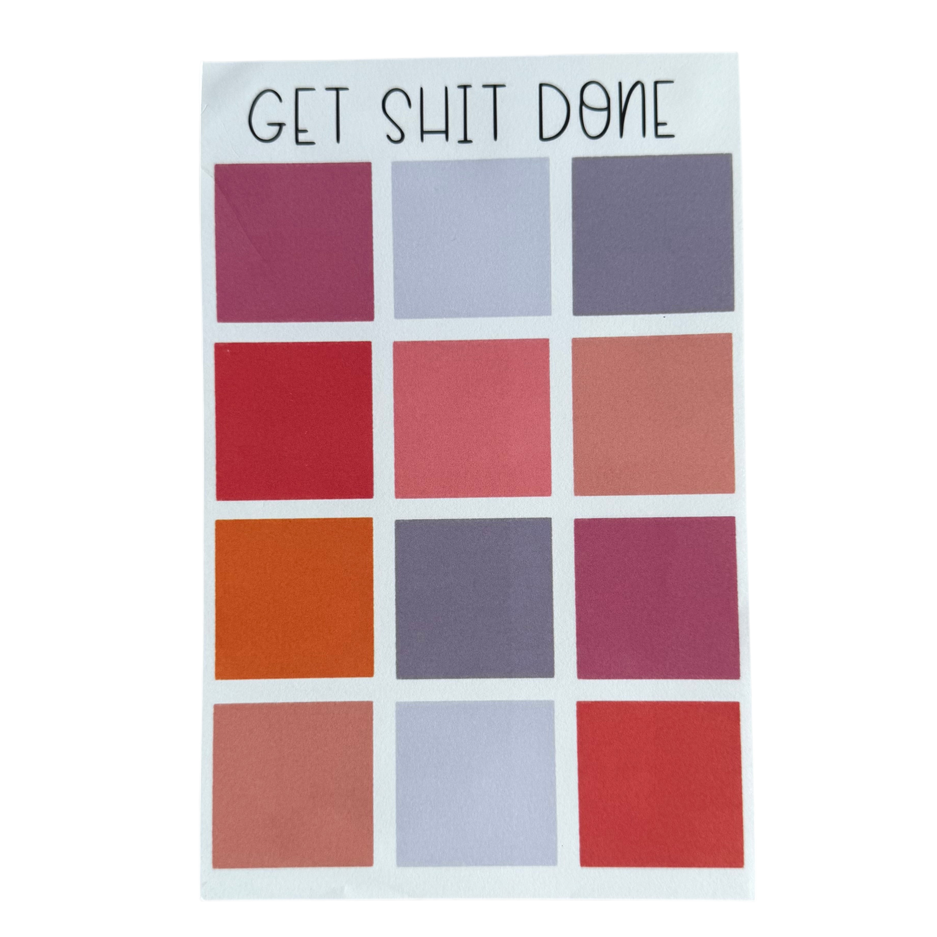 Stay on top of your game with the Get Shit Done Notepad! This fun and colorful notepad turns your to-do list into a vibrant productivity party. Jot down tasks, goals, and ideas with a splash of personality. Perfect for those who like their planning bold and their motivation loud. Get ready to crush your day, one colorful checkmark at a time!