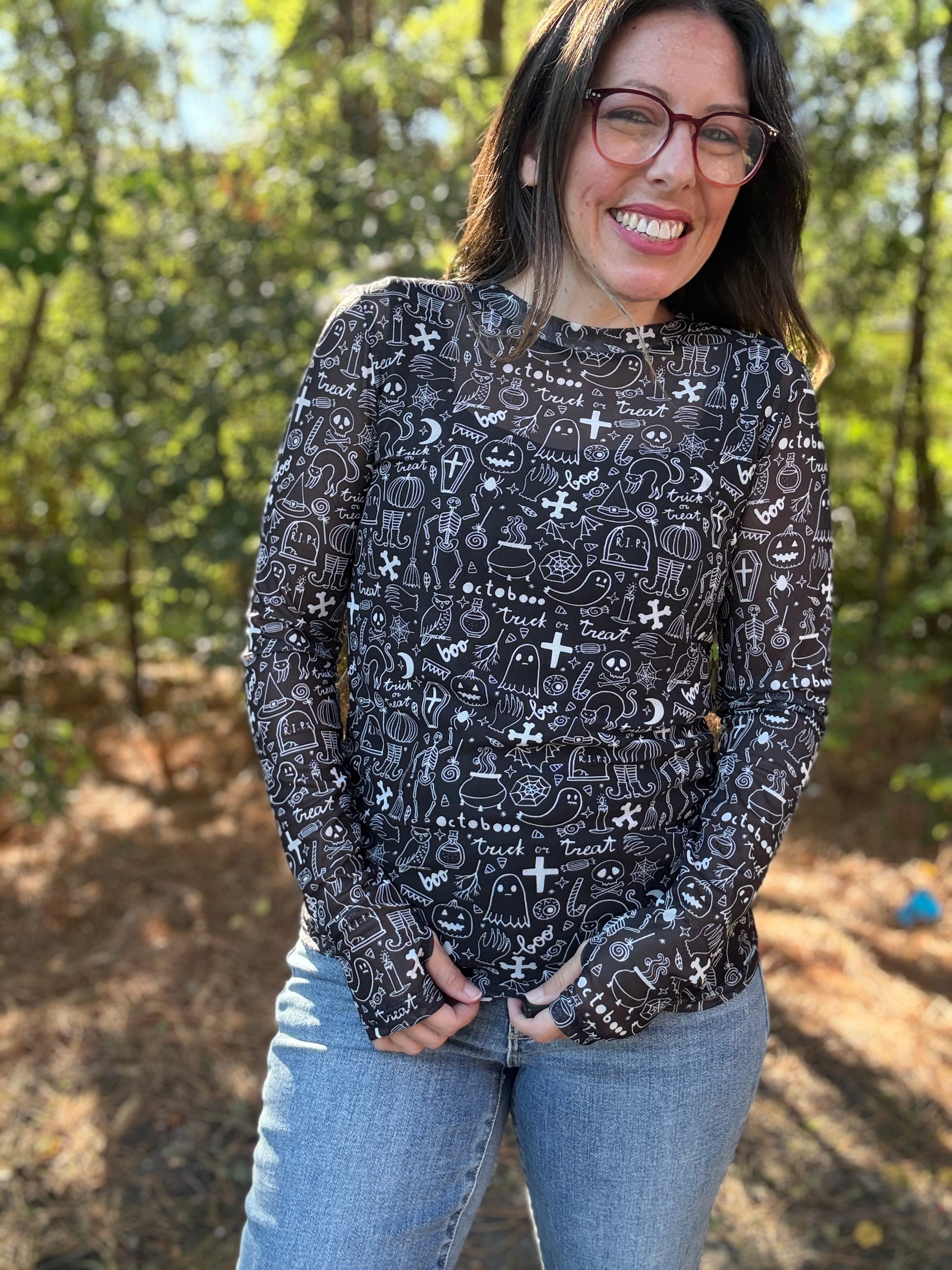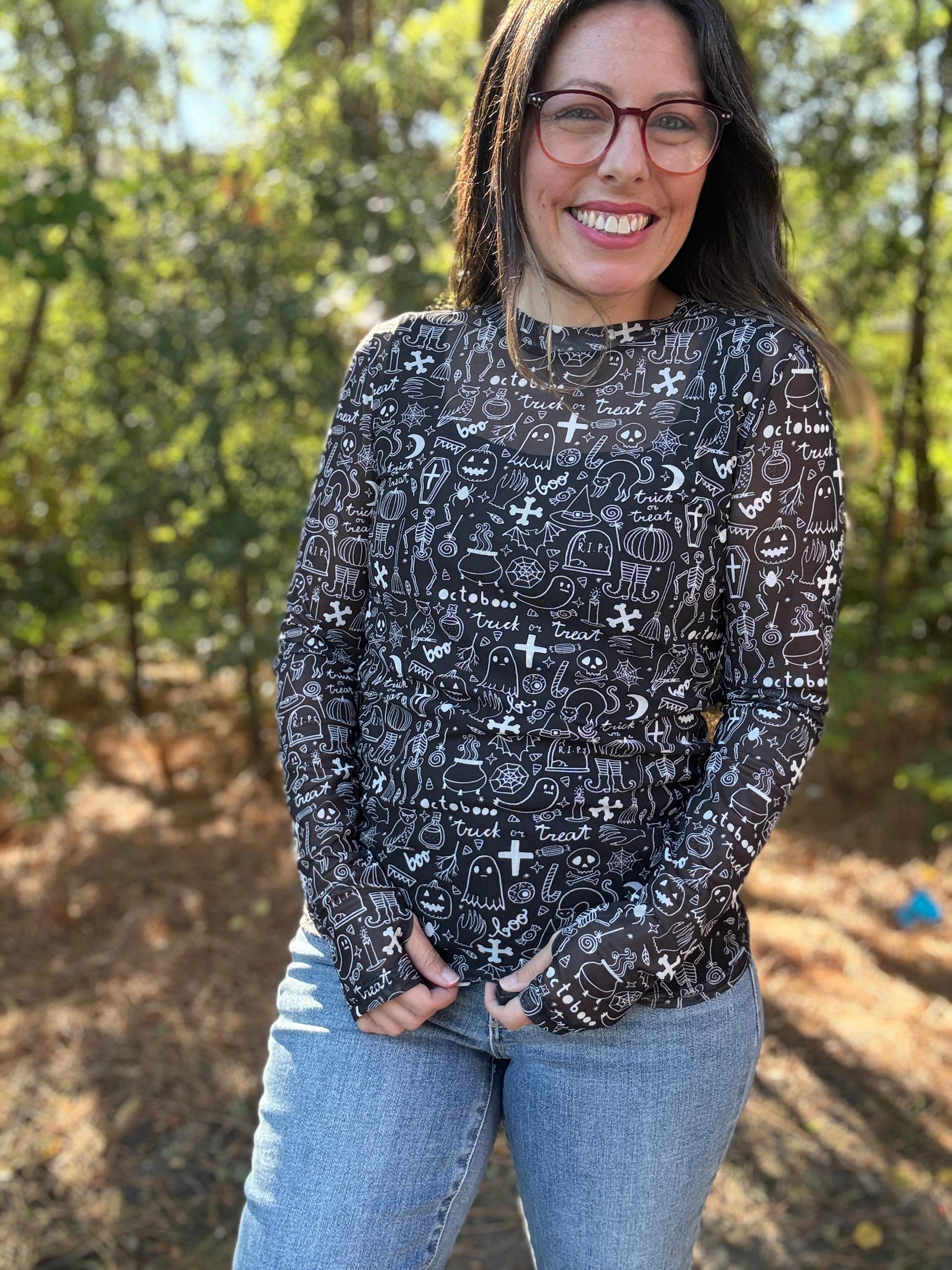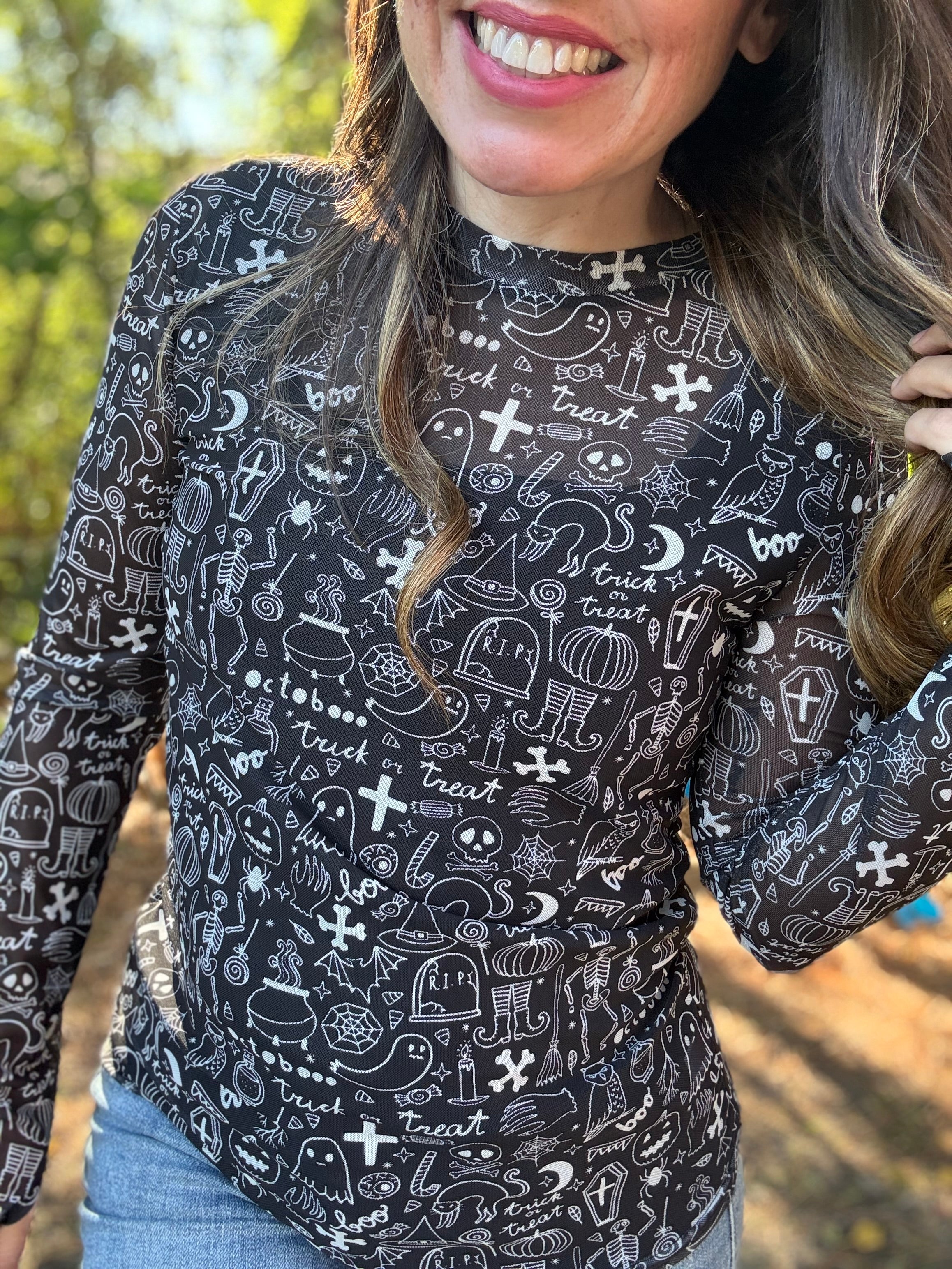 Turn up the Halloween vibes with our Spooky Mesh Top. The black and white design adds a touch of spookiness, perfect for the season. Wear it under a graphic tee for a layered look or over a tank for a breezy style. Get ready to be the best dressed at any Halloween party!