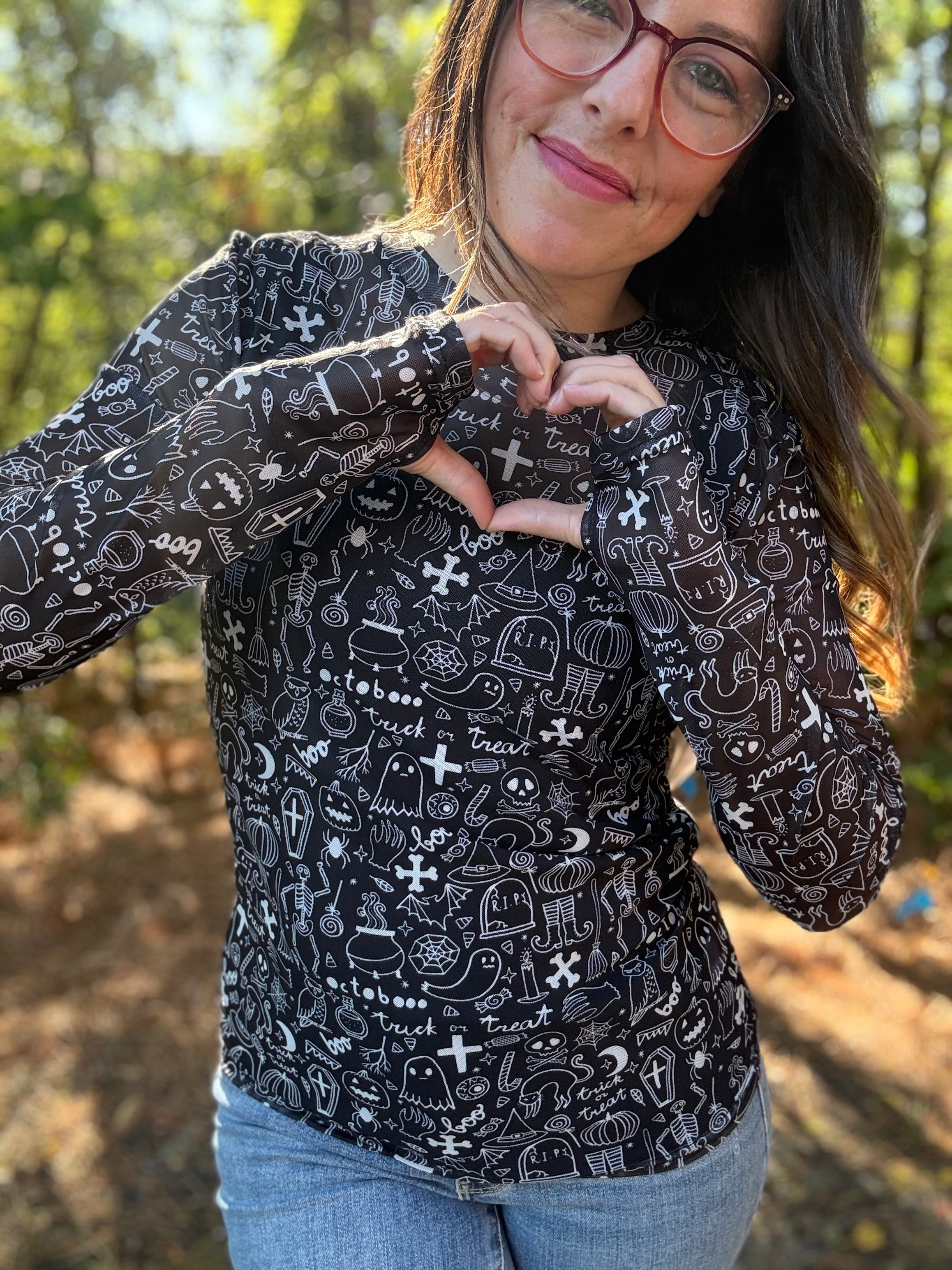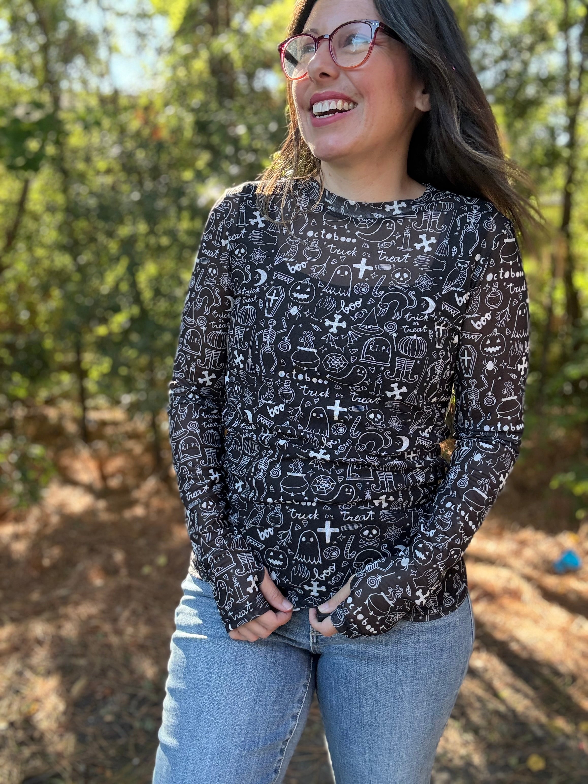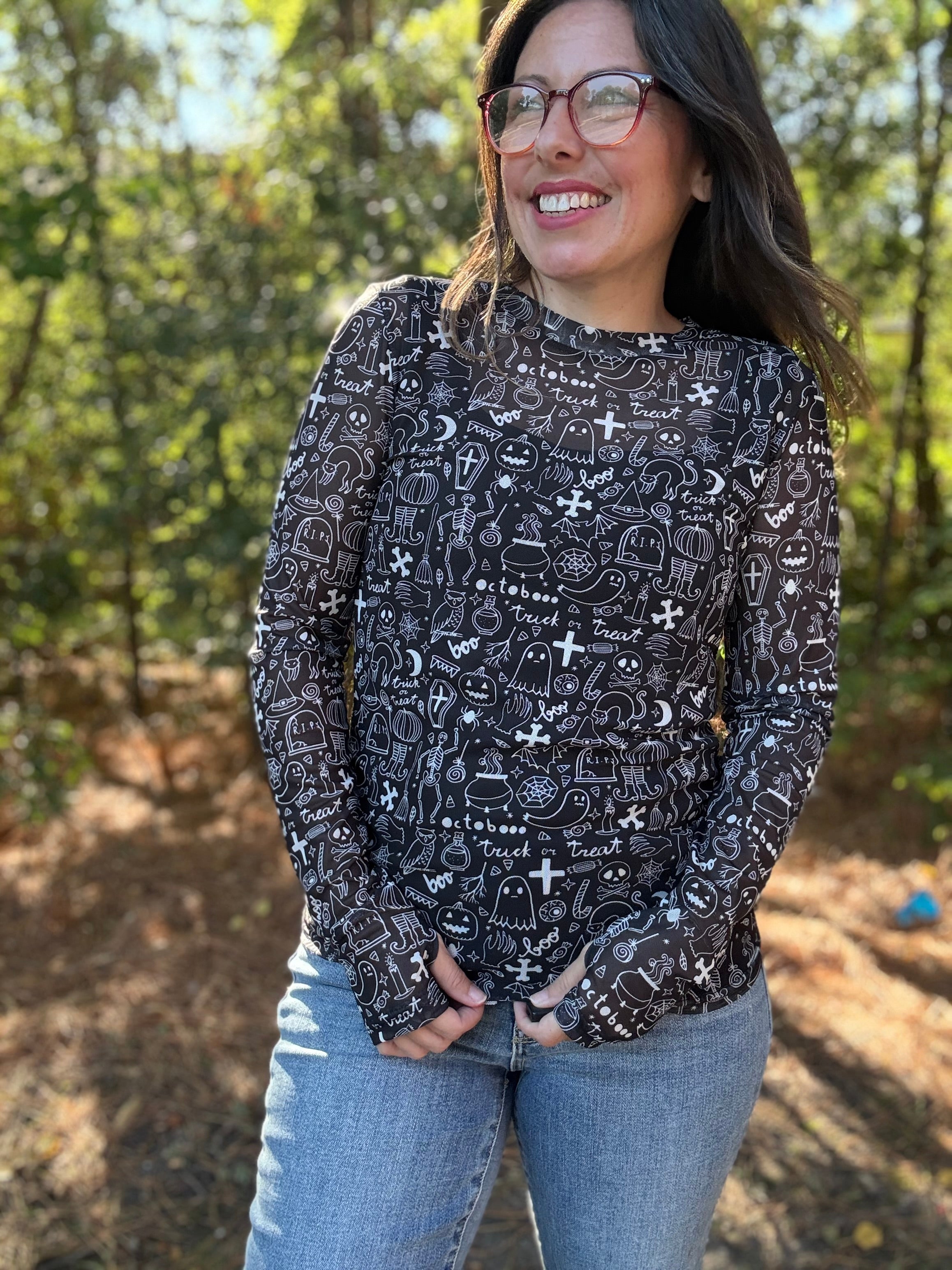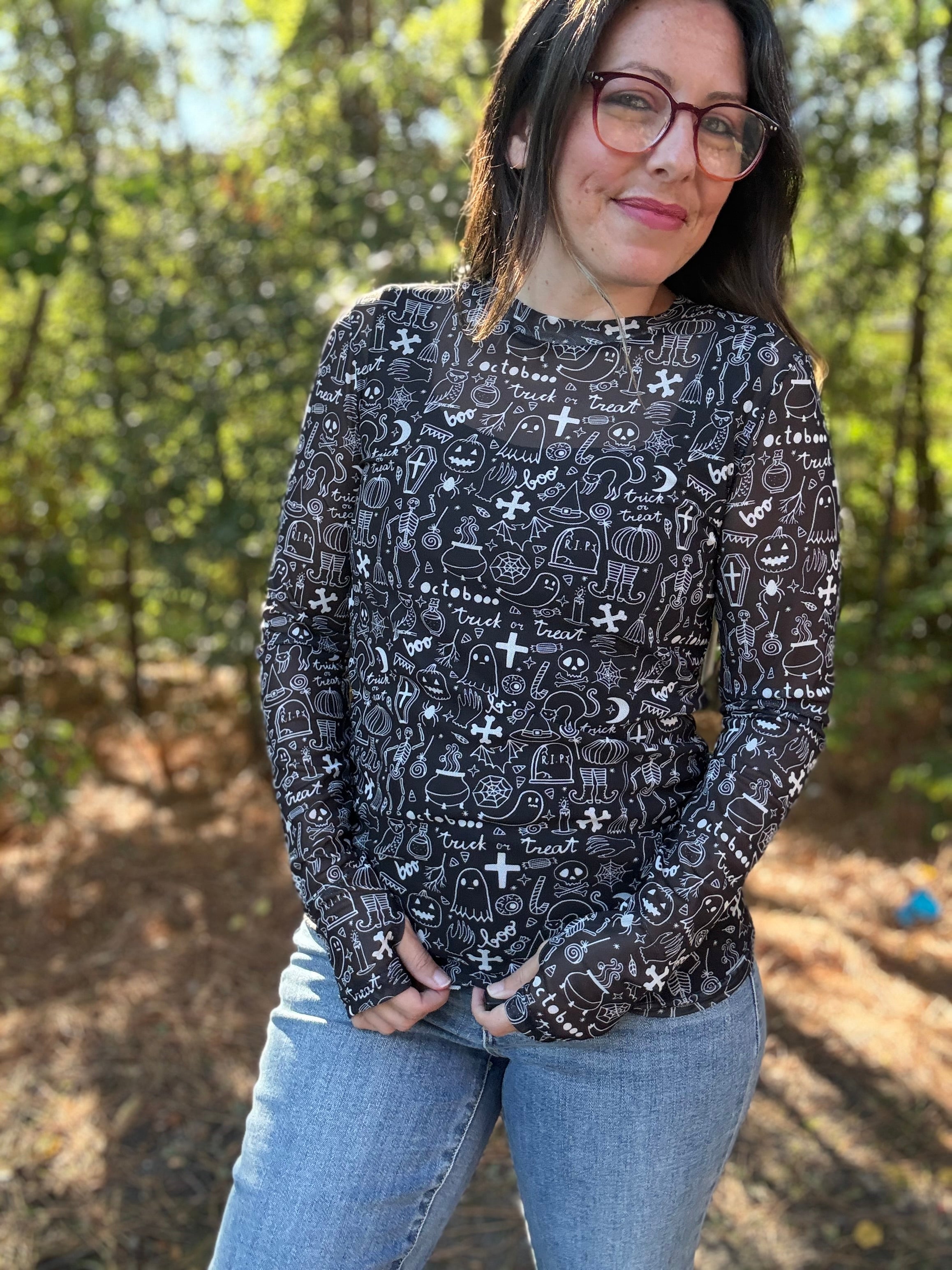 Turn up the Halloween vibes with our Spooky Mesh Top. The black and white design adds a touch of spookiness, perfect for the season. Wear it under a graphic tee for a layered look or over a tank for a breezy style. Get ready to be the best dressed at any Halloween party!