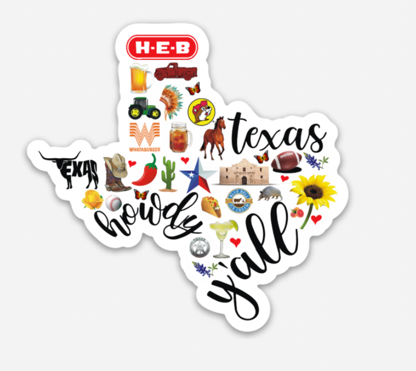 Things are bigger and better in Texas! This adorable sticker has many Texas "symbols" such as HEB, howdy, y'all, Whataburger, boots, and bluebonnets. These stickers are perfect for laptops, water bottles, tumblers, notebooks, and even cars!