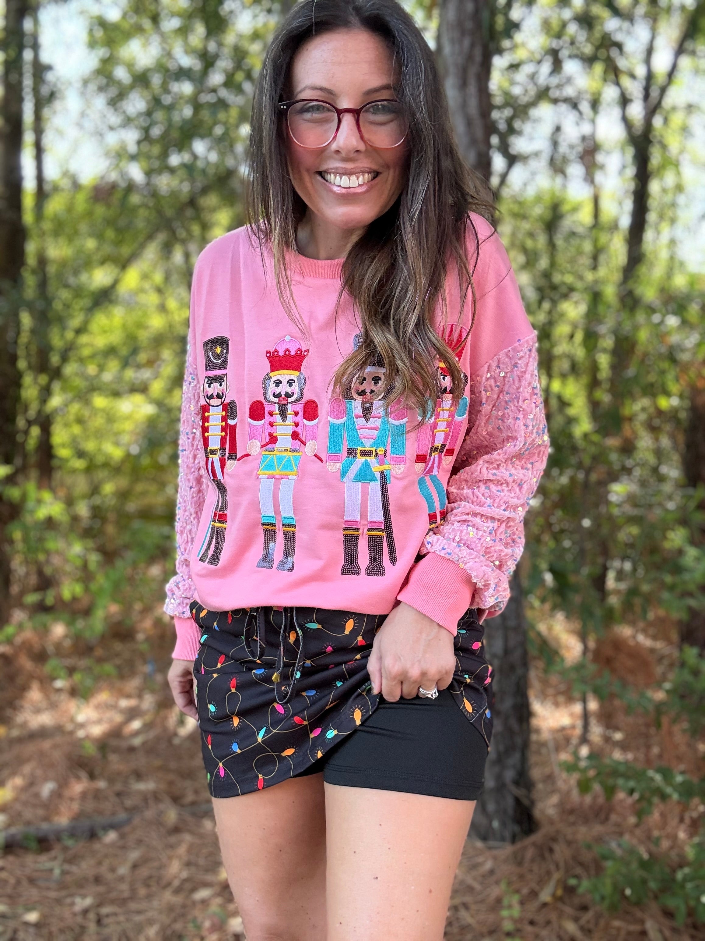 Check out our Christmas Lights Skort! This festive piece features a vibrant multi colored Christmas lights, along with a comfy elastic waistband and functional drawstring. Plus, it's equipped with side pockets and built-in shorts for added convenience. Made with stretchy material, it's perfect for all your holiday outings!