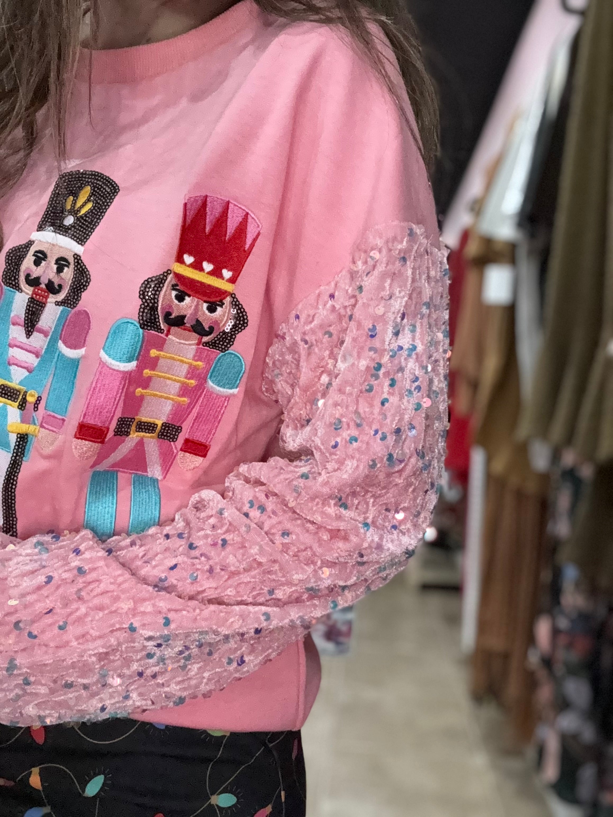 Get into the holiday spirit with our Nutcracker To Sparkle Sequin Top! Adorned with nutcrackers and pink sequin sleeves, this top is perfect for all your Christmas parties. Stand out and spread holiday cheer with this sparkling addition to your wardrobe.